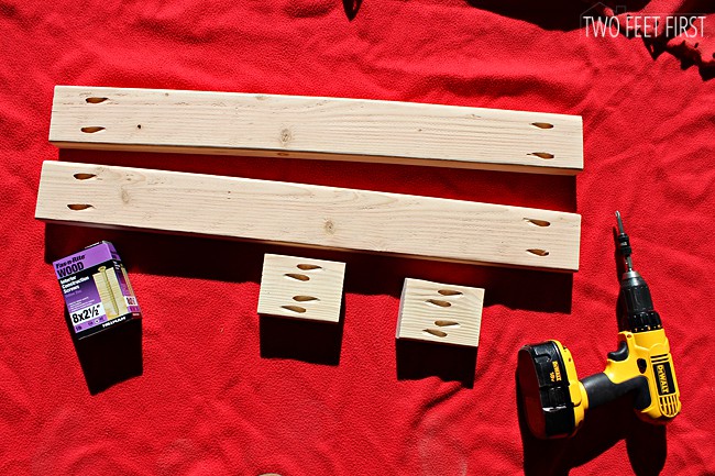 After cutting the wood, we used our Kreg Jig to create pockets in the wood. If you do not have one I would highly recommend buying one. The diagrams above show where we placed our pockets (=*). If there are ** together that means that for the width (2″ side) place a pocket on each side of the board (see picture below for example).