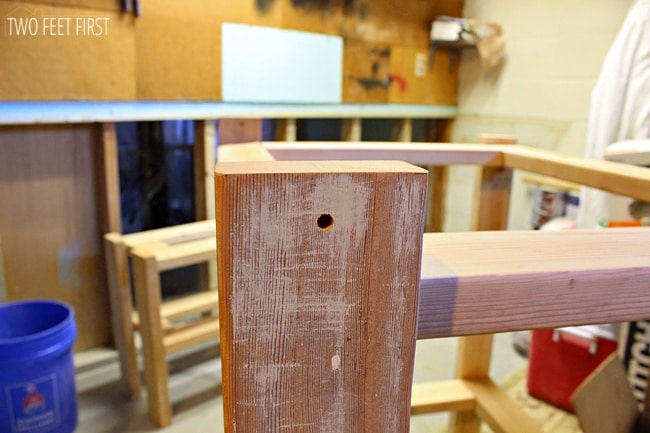 Builing-base-of-storage-benGrab the other frame and attach to the legs, spacing it 10″ from the bottom of the legs (this will give space to store paint cans under the bench). After both shelves are added take the other two legs and add them the same way, making sure to add the same size board across from the other.
