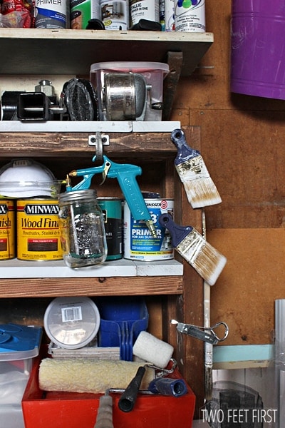 I decided to use magnets (found at the hardware store) to hold my paint brushes on the wood frame. To attach them, I applied a small amount of liquid nails to the magnet then pressed the magnet to the wood until it stuck by itself, which was not very long. I also use some old coat hooks to hold random things on the workbench, like this one holds my paint sprayer.