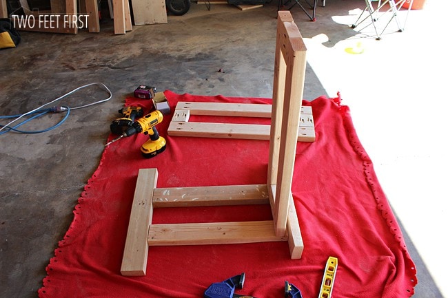 Grab the other frame and attach to the legs, spacing to the distance you would like (I centered mine in the middle). After both shelves are added take the other two top legs (2″x4″x22″) and add them exactly the same way. You will have something like this.