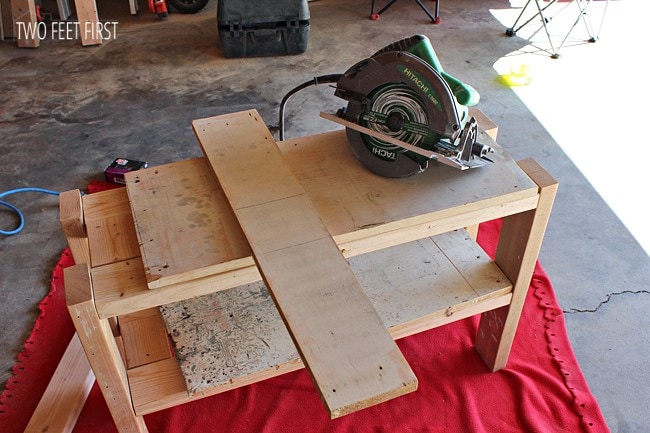 Now it was time to add the shelves to the frame. Because I was using the old boards I had to use the circular saw to cut the board down to size. But for the diagram I have attached, your boards will fit perfectly in the space.