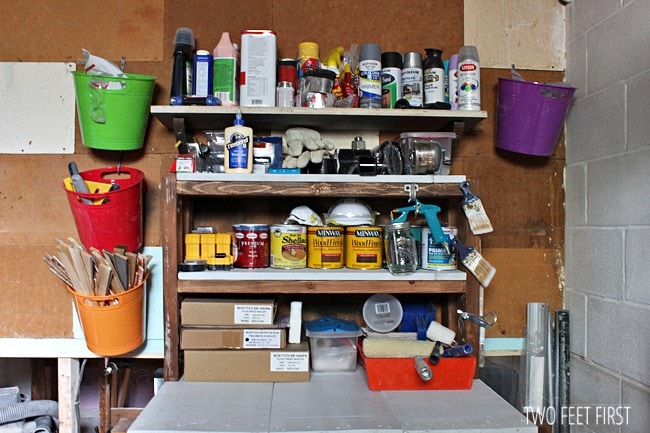 This project came to be after removing the old workbench to make room for our new plumbing (you can find that here). But guess what, that bench was our dropping zone for all our painting supplies, tools, and other random supplies. So after removing the bench our basement had boxes holding our supplies all over the floor, not ideal because I could not find anything. We needed a place to store our tools, painting supplies and all the other random stuff but we did not want to spend a lot of money.