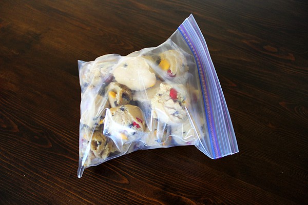 After cookie dough is frozen place into a freezer zip-lock bag. To make your life a little easier, write the baking instructions onto the bag.