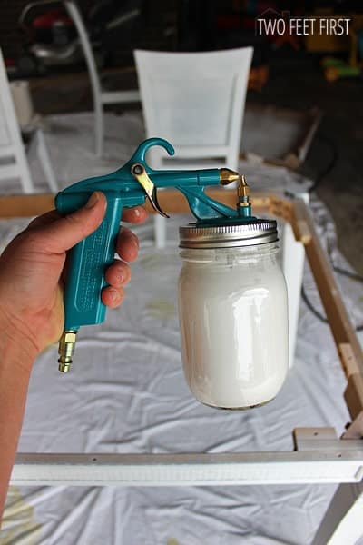 Then I sprayed all the frames with two coats of primer. After the primer dried, I lightly sanded the frames with #600 grit sandpaper, making sure to clean the chairs before the next step. Next I painted the chairs with two coats of Behr white paint with some Floetrol… added to help smooth the paint as it dries.